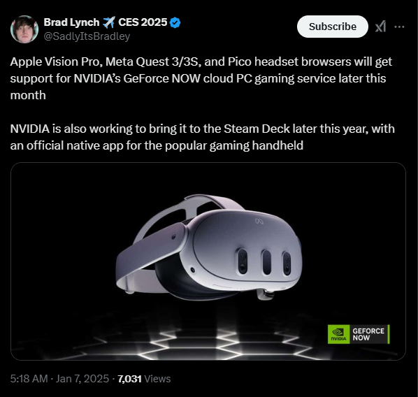 Podczas tegorocznych targów CES 2025 znany youtuber Sadly Its Bradley poinformował na platformie X (Twitter), że GeForce Now – popularna platforma gamingowa w chmurze – zyska wsparcie dla Meta Quest 3/3S, Apple Vision Pro oraz Pico. Ale to nie wszystko – NVIDIA planuje wprowadzić usługę także na Steam Decka jeszcze w tym roku. Wydarzenie to może na dobre zmienić sposób, w jaki korzystamy z technologii VR i chmury.