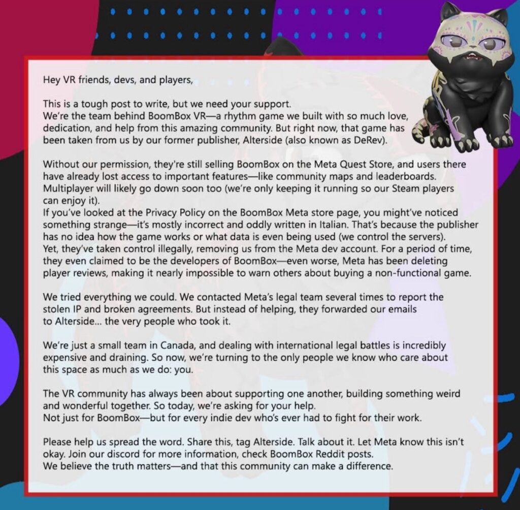 TL;DR: BoomBox VR zniknęło deweloperom z rąk – wydawca Alterside przekierował stronę Meta Quest na siebie, przestał wypłacać tantiemy i blokuje aktualizacje. Gracze mogą wkrótce stracić tryby sieciowe, a sam spór pokazuje, jak łatwo indie‐hit może zostać „przejęty” na zamkniętej platformie. Uważaj, co kupujesz w wirtualnym sklepie.
