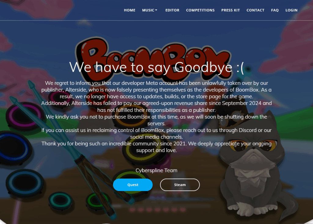 „We regret to inform you that our developer Meta account has been unlawfully taken over by our publisher, Alterside…” – czytamy w dramatycznym wpisie „We have to say Goodbye” na oficjalnej stronie gry. Studio informuje tam także o braku wypłat tantiem od września 2024 r. i planowanym wyłączeniu serwerów społecznościowych.