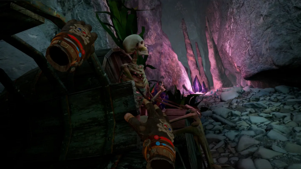 Pod względem technicznym Pirates VR: Jolly Roger również prezentuje się dość solidnie. Nie natrafiłem tu na żadne poważne bugi, a całość działała bardzo płynnie. Ładną jak na Questa grafikę gra okupuje wykorzystaniem AppSW, czyli systemu reprojektowania klatek dla zwiększenia wydajności, przez co niektórym mogą dokuczać związane z nim artefakty graficzne podczas szybkich ruchów – ja jednak wyjątkowo nie miałem z tym problemów. Pewne zastrzeżenia mam natomiast co do systemu ekwipunku, który był trochę niewygodny, a także mechanik interakcji z przedmiotami, zwłaszcza ich chwytania – gra używa pasywnego chwytu i nie ma opcji przełączenia go na aktywny, przez co zdarzają się problemy z odkładaniem przedmiotów do ekwipunku. Nie do końca poprawnie działa pływanie z wykorzystaniem ruchów rąk, a używanie kilofa jest dość uciążliwe, ponieważ przenika on przez skały, które próbujemy rozłupywać. To wszystko drobnostki, które zawsze można je poprawić w następnym patchu i nie wpływają one na ogólny odbiór gry, a ta z każdą swoją minutą zyskuje na atrakcyjności. A gdy zaczyna już mocniej wkręcać, to nagle… pojawiają się napisy końcowe.