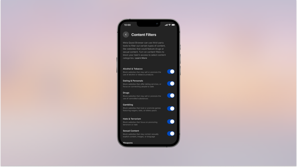 Wersja v53 wprowadza nowe narzędzie – filtr kategorii stron przeglądarki Meta Quest, które pomoże rodzicom i opiekunom zarządzać tym, czego nastolatki mogą szukać i przeglądać w przeglądarce Meta Quest. Rodzice mogą skonfigurować to narzędzie, przechodząc do zakładki Nadzór rodzicielski w aplikacji mobilnej Meta Quest. Stamtąd mogą blokować strony internetowe na podstawie takich kategorii jak „Alkohol” czy „Przemoc”. Ustawienia są indywidualne dla każdego konta, więc rodzice mający kilkoro dzieci mogą wybrać różne ustawienia odpowiednie dla każdego z nich, a ich nastoletnie pociechy otrzymają powiadomienia e-mailowe, gdy ich rodzic lub opiekun skonfiguruje nowy filtr.